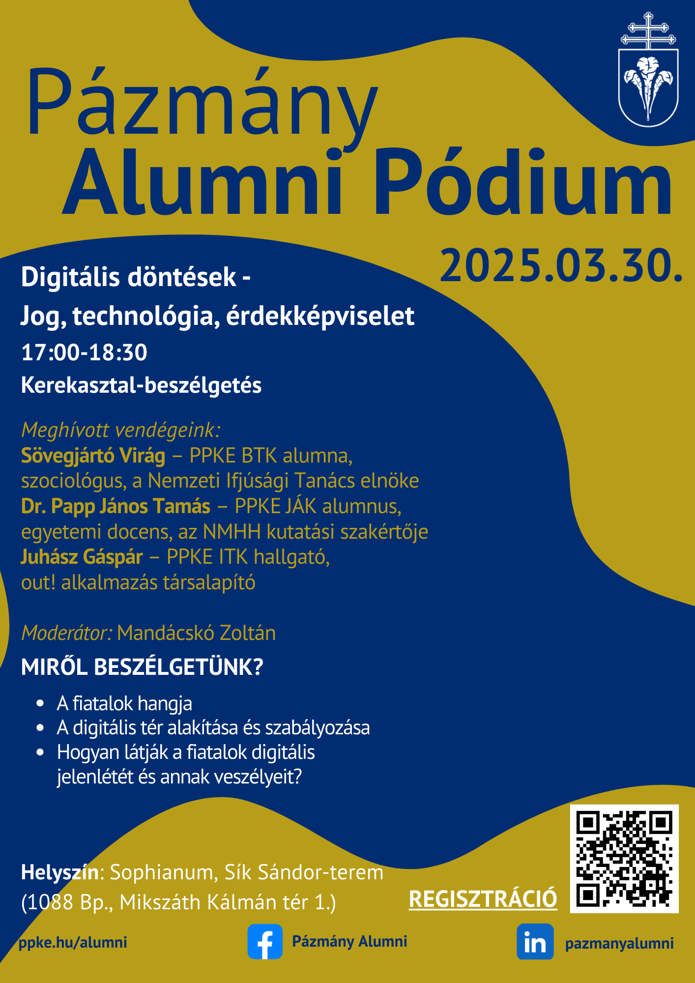 2026 március 30-án, hétfőn 17 órától Pázmány Alumni Pódiumot szervezünk. Az eseményen egy izgalmas kerekasztal-beszélgetéssel várjuk az érdeklődőket, ahol az érdekképviselet, a digitális tér szabályozása és a fiatalok online jelenléte kerül fókuszba.