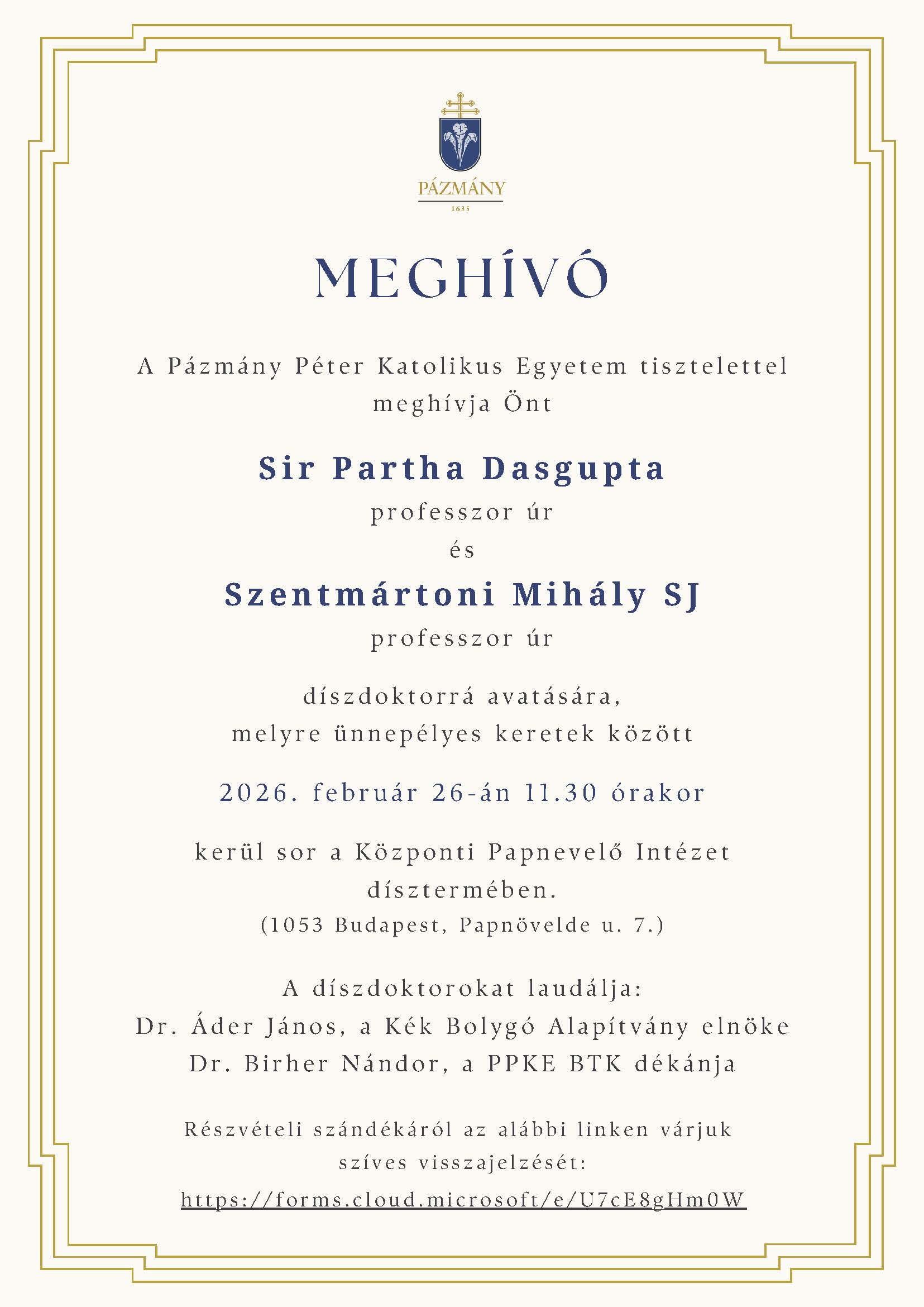 Díszdoktoravató 2026. febr. 26. 11:30 Részvételi szándékáról az alábbi linken várjuk szíves visszajelzését: https://forms.cloud.microsoft/pages/responsepage.aspx?id=zyQXVnBvK0-v7DDMco90vUDSbTBF-5JAqyLbEzQVeydUOE5aSVE5M1lNR1RVRDQzQjRONE8yT1FKMS4u&route=shorturl Facebook megosztás Küldés e-mailben URL vágólapra másolása