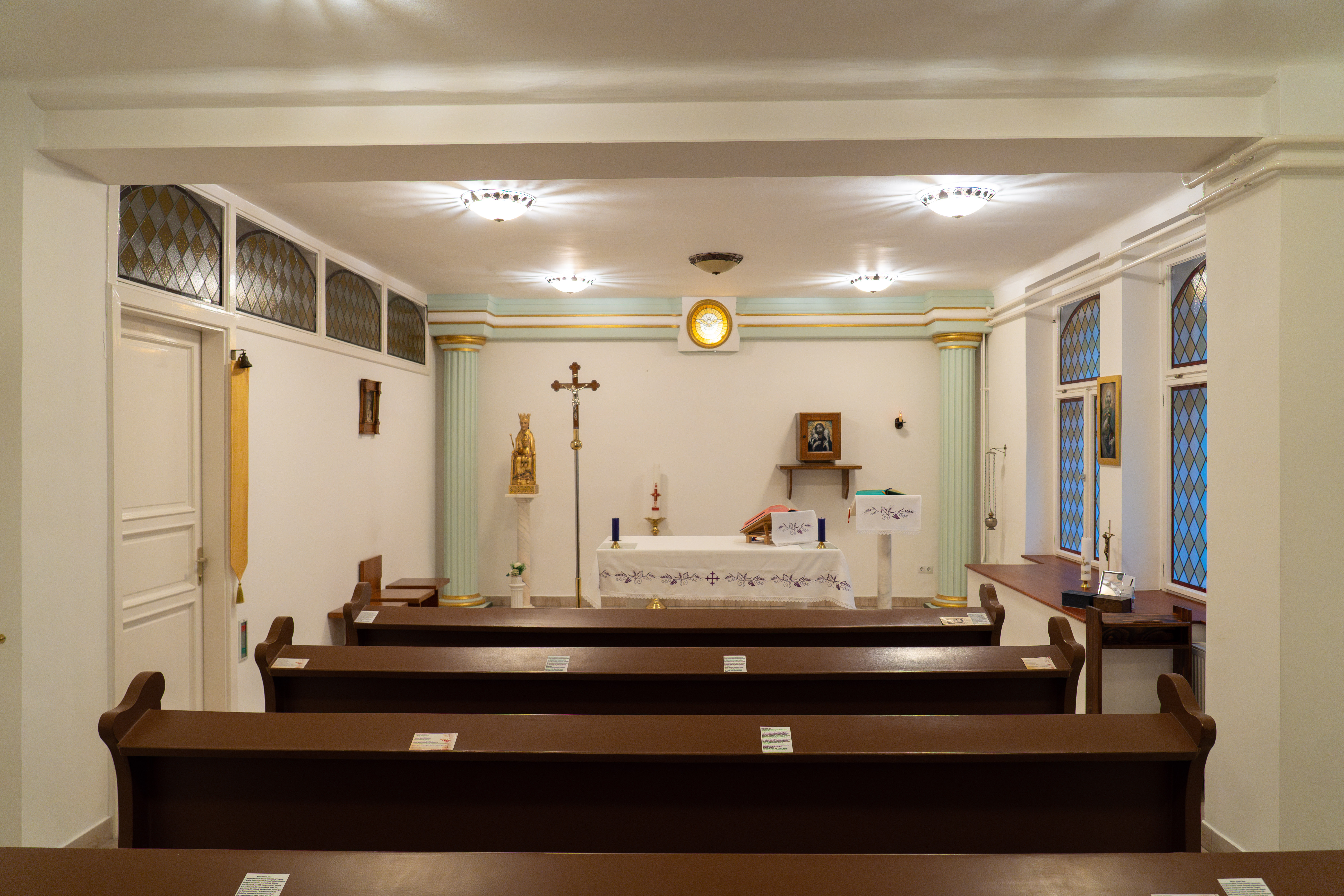 Az előcsarnokban, a bejárattól jobbra található kápolna kialakítására akkor került sor, amikor az épületet az Egyetem, illetve a Jog- és Államtudományi Kar igényeinek megfelelően felújították és átalakították. A 2000 nyarán felszentelt kápolna falán látható, a stációkat ábrázoló tűzzománc képek, valamint a tabernákulum díszítése Hertai Mária munkája. Az oltártól balra található „Bölcsesség széke” Szűz Mária szobor egy XIII. századi belgiumi szobor másolata.