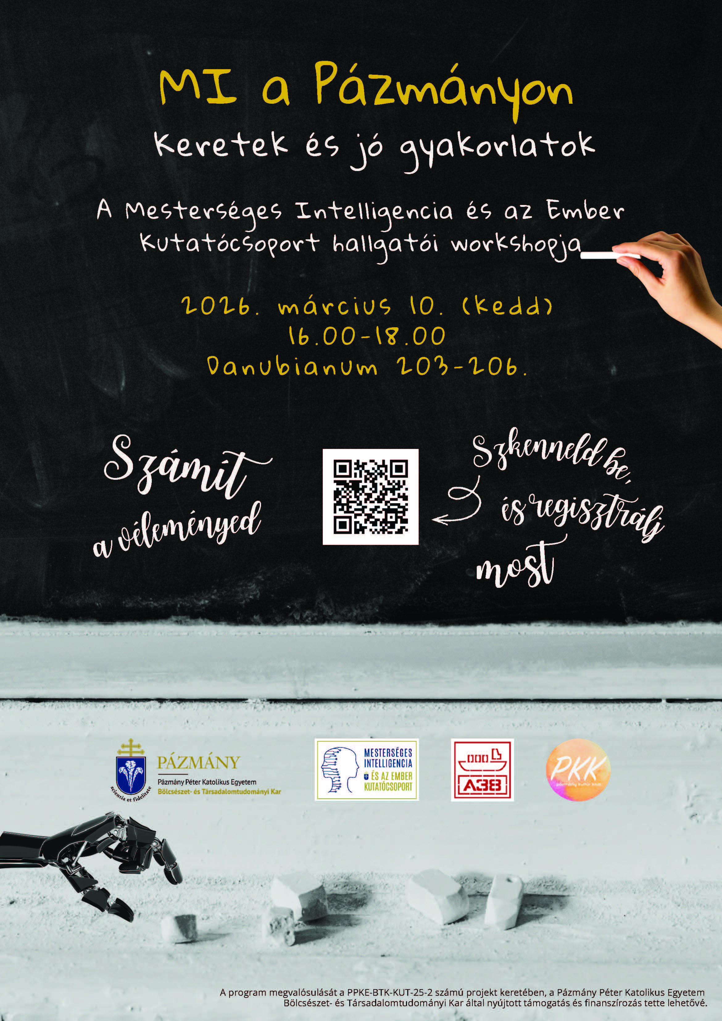 MI a Pázmányon -A Mesterséges Intelligencia és az Ember Kutatócsoport hallgatói workshopja 2026. márc. 10. 16:00 Facebook megosztás Küldés e-mailben URL vágólapra másolása