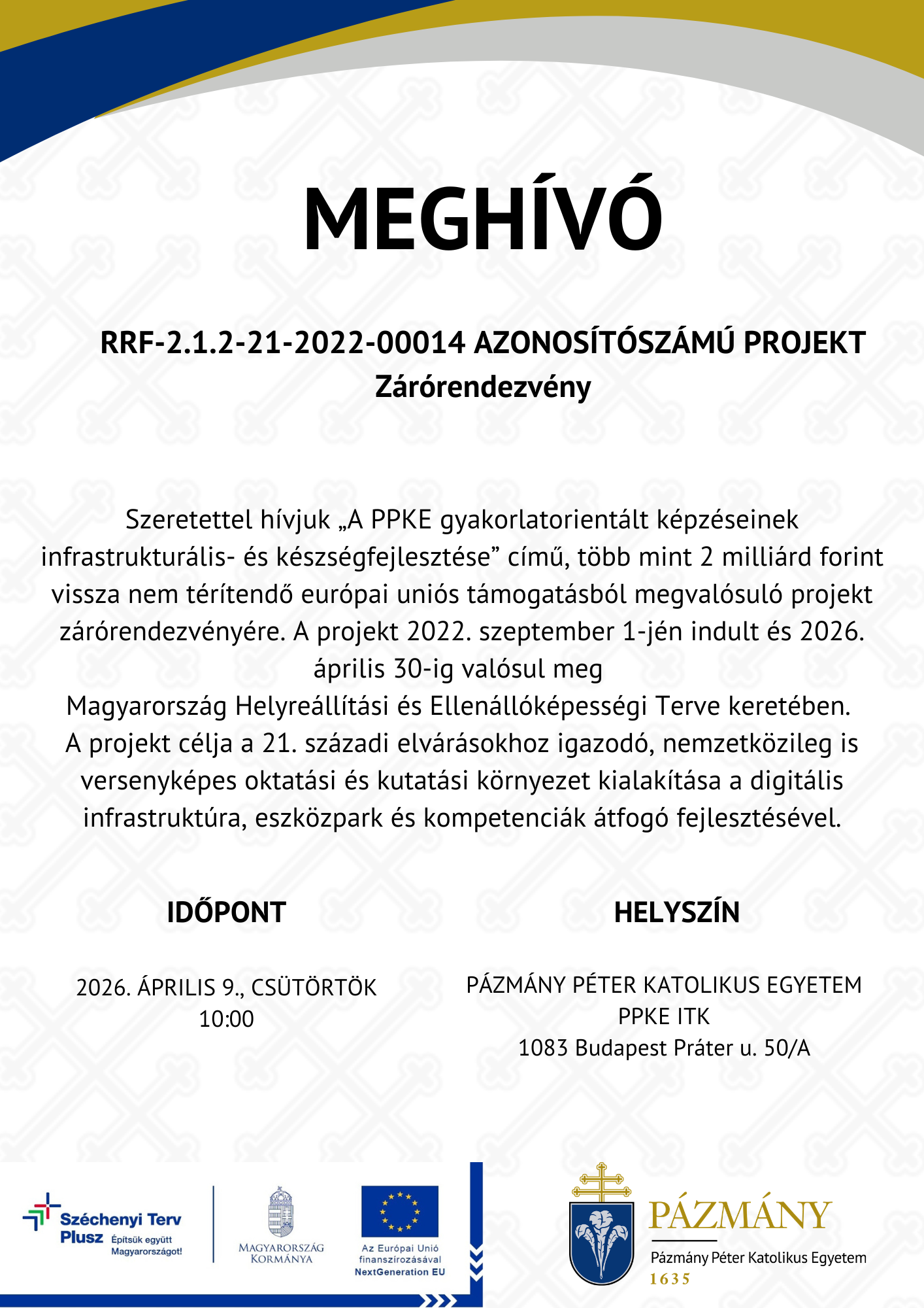 Szeretettel hívjuk „A PPKE gyakorlatorientált képzéseinek infrastrukturális- és készségfejlesztése” című, több mint 2 milliárd forint vissza nem térítendő európai uniós támogatásból megvalósuló projekt zárórendezvényére. A projekt 2022. szeptember 1-jén indult és 2026. április 30-ig valósul meg Magyarország Helyreállítási és Ellenállóképességi Terve keretében.
